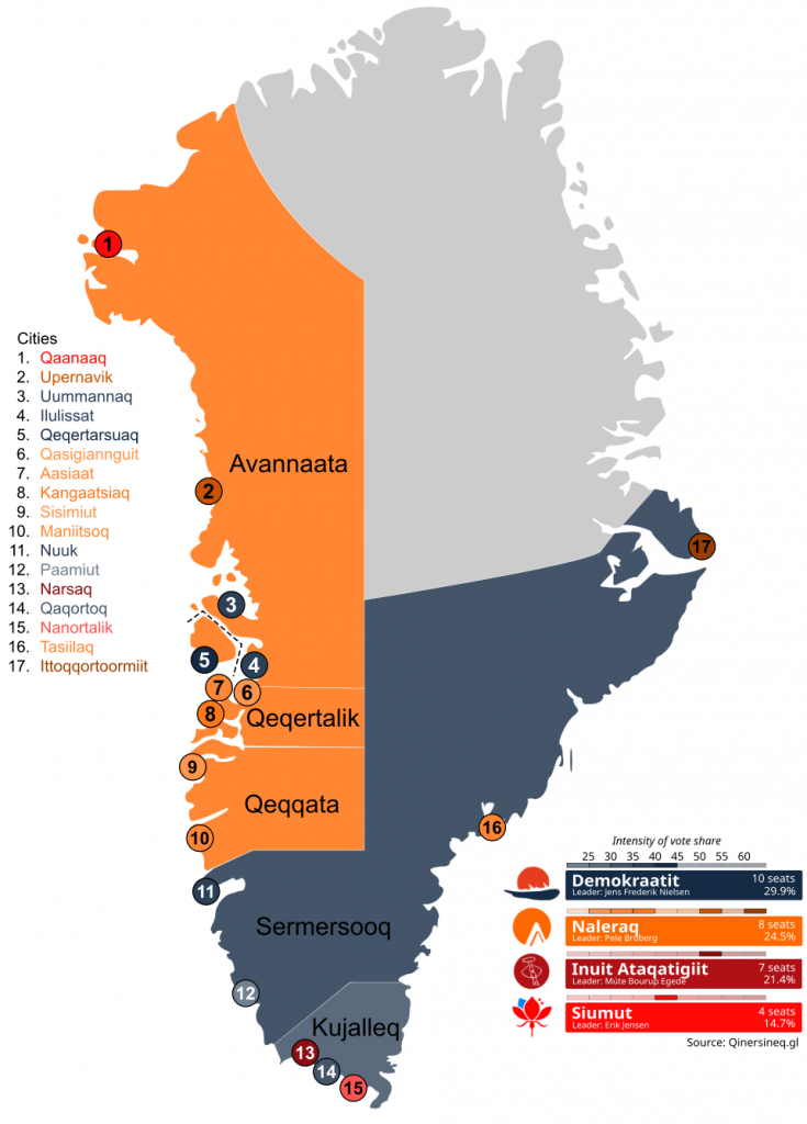 Les deux partis, Siumut et IA, subissent une véritable chute (15 points de perdus). C’est même le pire score de leur histoire pour les sociaux-démocrates de Siumut (qui ont été sans discontinuité au pouvoir sauf à deux reprises). C’est aussi la pire défaite d’une coalition groenlandaise sortante (perte de 31 points). Les conservateurs de Atassut ont une très légère augmentation.
