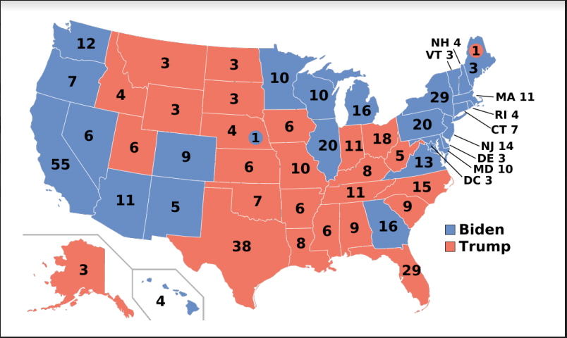 Le vainqueur de cette élection est Joe Biden avec 302 grands électeurs contre 232 pour Donald Trump. Ce résultat est le même qu’en 2016. Cette élection a connu son plus fort taux de participation. Le nombre de voix a été le plus important, que ce soit côté démocrate ou républicain.