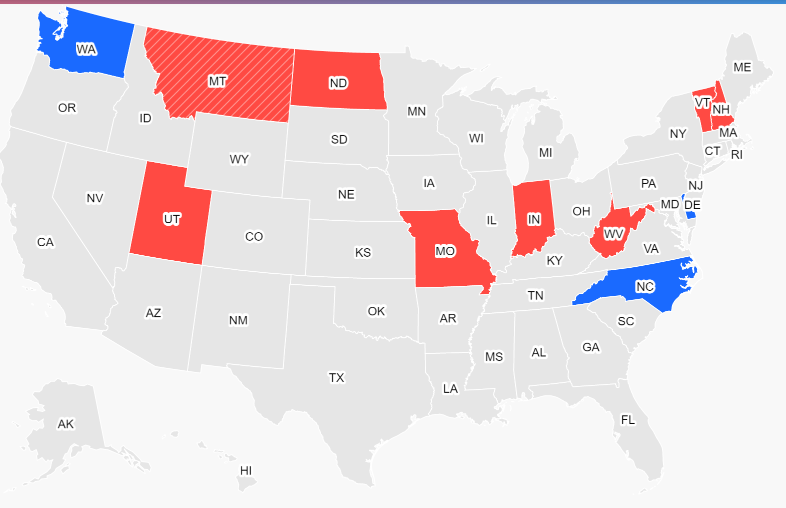 Au niveau des gouverneurs, les démocrates ont perdu le Montana, ce qui fait un total de 3 pour les démocrates et 8 pour les républicains. Deux autres territoires (Porto Rico et les Samoa américaines) ont vu aussi un nouveau gouverneur être élu.
